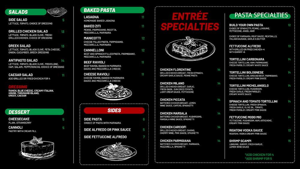 The appetizers, such as fried calamari and garlic knots, are perfect for sharing. For pasta lovers, options like fettuccine alfredo and shrimp scampi provide delightful dining experiences. The dessert selection includes cannoli and New York cheesecake, ideal for finishing off a meal.