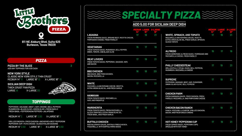 Welcome to Little Brothers Pizza, a beloved family-owned pizzeria located in Burleson, TX. Specializing in delightful Italian pizzas and pasta, we pride ourselves on quick service and a warm atmosphere perfect for lunch, dinner, or solo dining. Whether you're grabbing a bite to eat on the go or enjoying a meal with friends, our menu features local specialties and comforting favorites. With accessible seating, family-friendly options, and a selection of beers and wines, Little Brothers Pizza is the ideal spot for everyone. Come join us for a casual dining experience that feels like home!